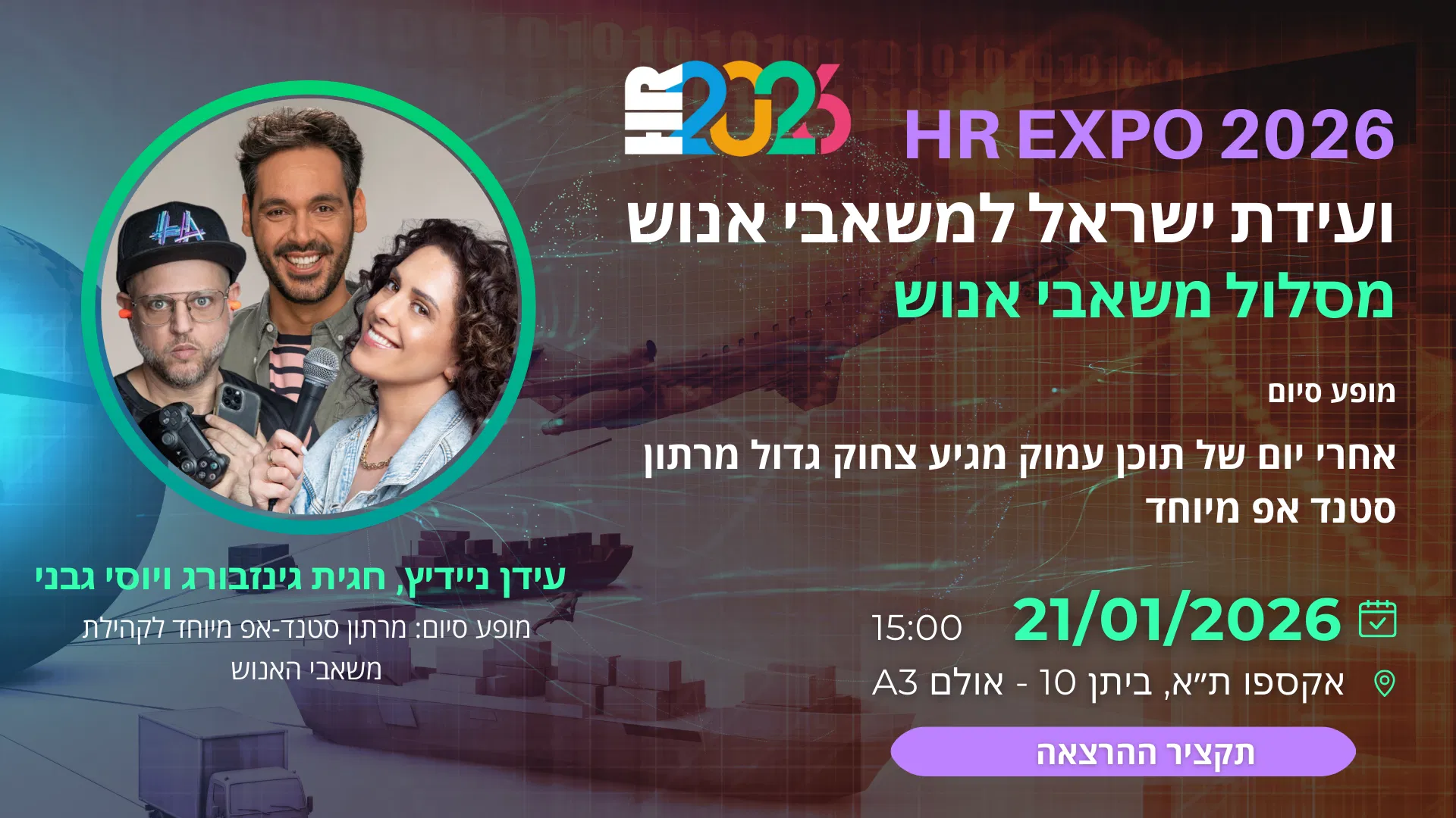 15:00 | מופע סיום: מרתון סטנד-אפ מיוחד לקהילת משאבי האנוש (אולם A3)