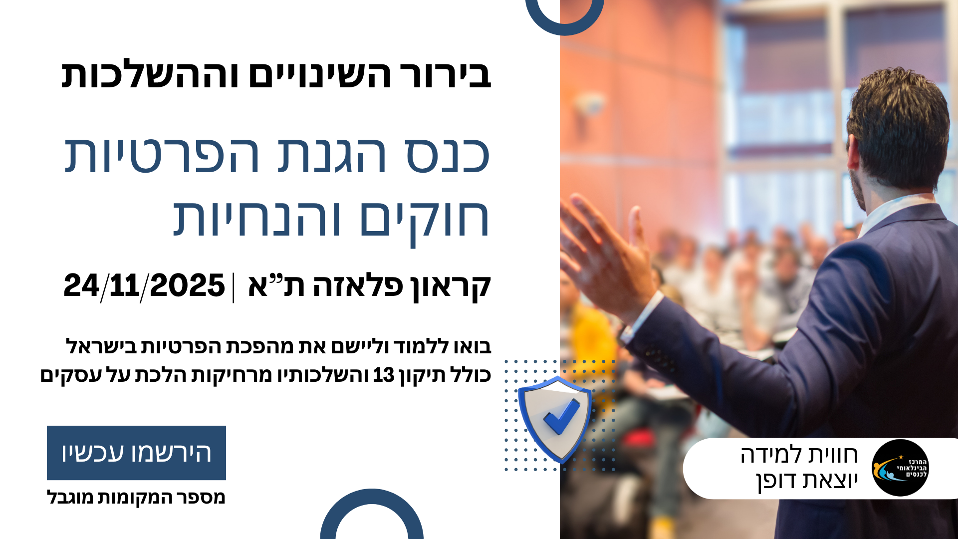 בואו ללמוד ממומחים מובילים על ההשלכות, ההשפעות, והמשמעויות של תיקון מס' 13 לחוק הגנת הפרטיות על העסק והארגון שלכם.